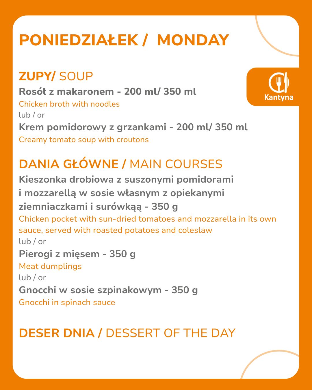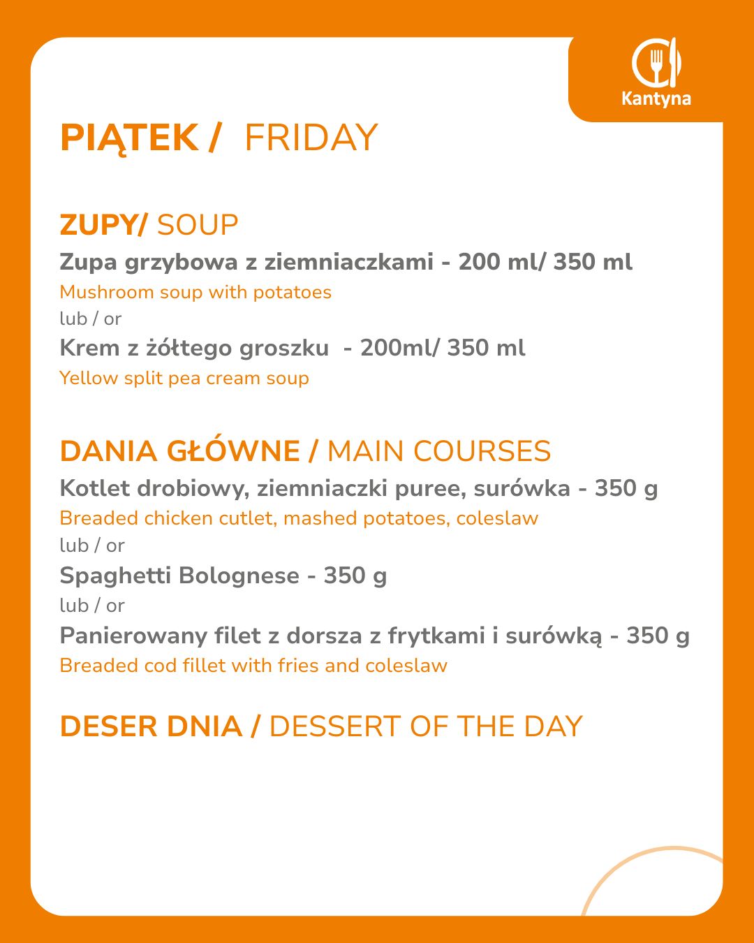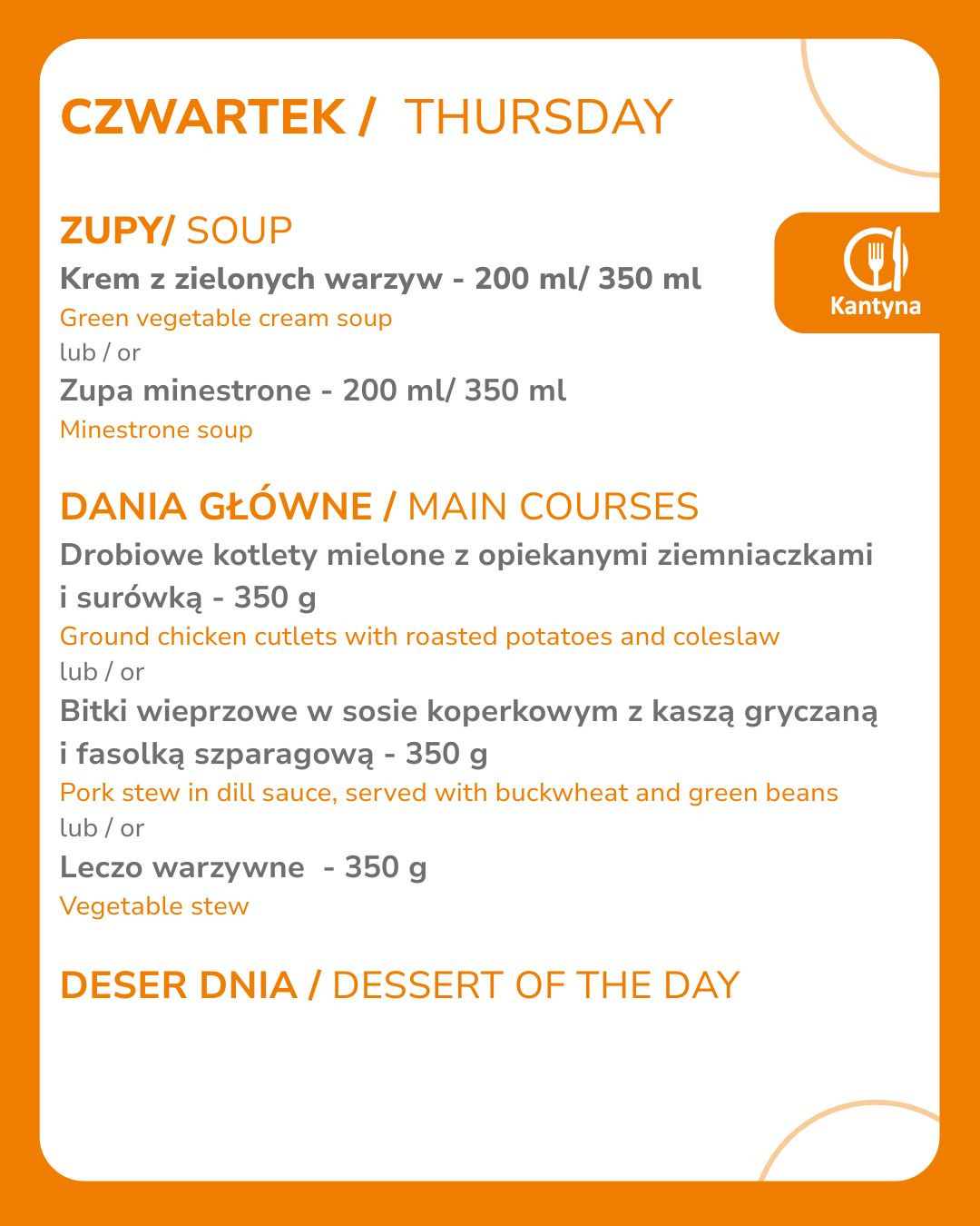Obejmuje: - zestawy obiadowe: zupa oraz danie główne (w tym potrawy mięsne oraz wegetariańskie) - ciasta - napoje gorące i zimne Wszystkie dania przygotowujemy na miejscu, dbając o najwyższe standardy higieny i jakości.