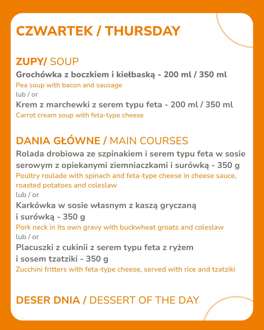 Obejmuje: - zestawy obiadowe: zupa oraz danie główne (w tym potrawy mięsne oraz wegetariańskie) - ciasta - napoje gorące i zimne Wszystkie dania przygotowujemy na miejscu, dbając o najwyższe standardy higieny i jakości.